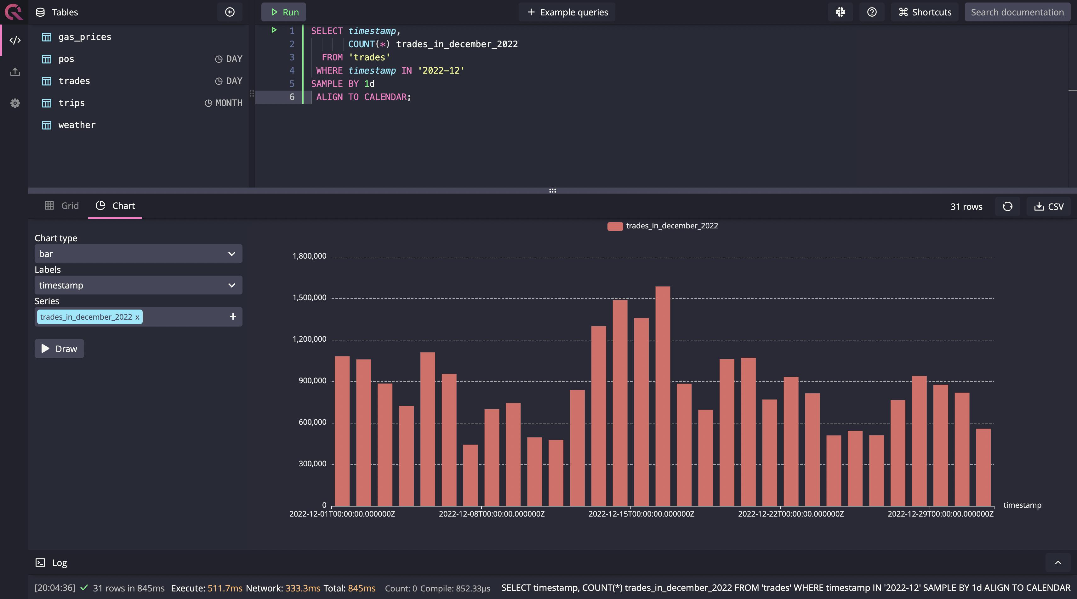 You can find missing data using a combination of the aforementioned SQL extensions. First, let's look at a basic query using these extensions to get a day-on-day count of trades in December till date this year, using the following query: